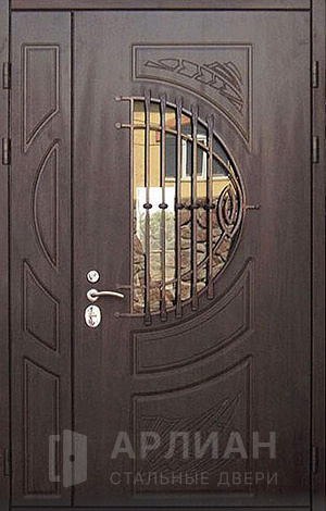 Кованая арочная входная дверь со стеклом и ковкой №69